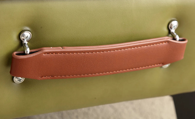 This Vintage Ottoman Bench – Tufted Accent Stool with Handle combines a classic tufted seat with modern, minimalist lines. The smooth synthetic leather upholstery offers a soft touch and a subtle sheen, while the contrasting handle detail adds a warm, vintage-inspired note.